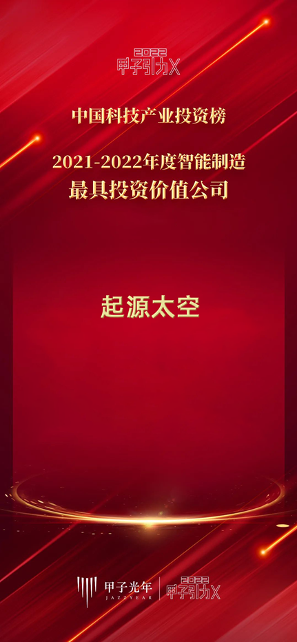 在本次峰會上,起源太空成功入選「甲子光年」“2021-2022年度智能制造最具投資價值公司”榜單。「甲子光年」表示,2022年,守在各個賽道的產(chǎn)業(yè)資本異常活躍,大跨步踏入創(chuàng)投圈。此消彼長間,風云變幻的創(chuàng)投江湖緩緩駛?cè)肓擞部萍纪顿Y的新時代。前期“十分耕耘、一分回報”,硬科技投資注定是一場長期主義實踐。作為領(lǐng)先的中國科技產(chǎn)業(yè)智庫,「甲子光年」持續(xù)關(guān)注著可真正促進科技進步與產(chǎn)業(yè)發(fā)展的投資機構(gòu)與科創(chuàng)企業(yè),秉持客觀公正的態(tài)度,采用科學完備的數(shù)據(jù)處理分析方法,通過公平公正的評選標準,輸出2021-2022年度科技產(chǎn)業(yè)投資機構(gòu)與科創(chuàng)企業(yè)明星榜單。