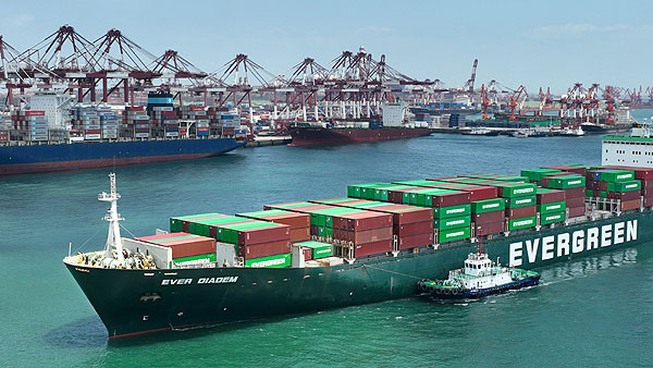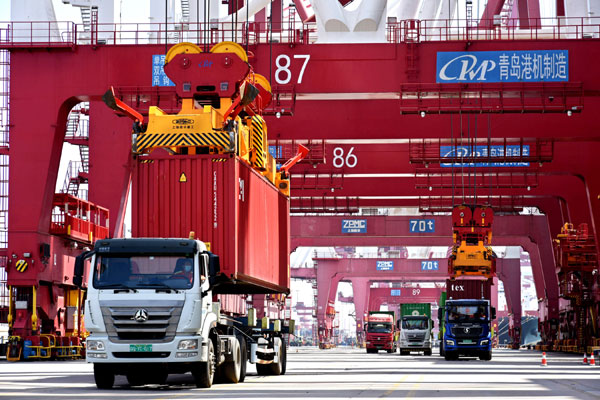 山東港口青島港前灣港區(qū),一艘集裝箱貨輪正進港靠泊碼頭。