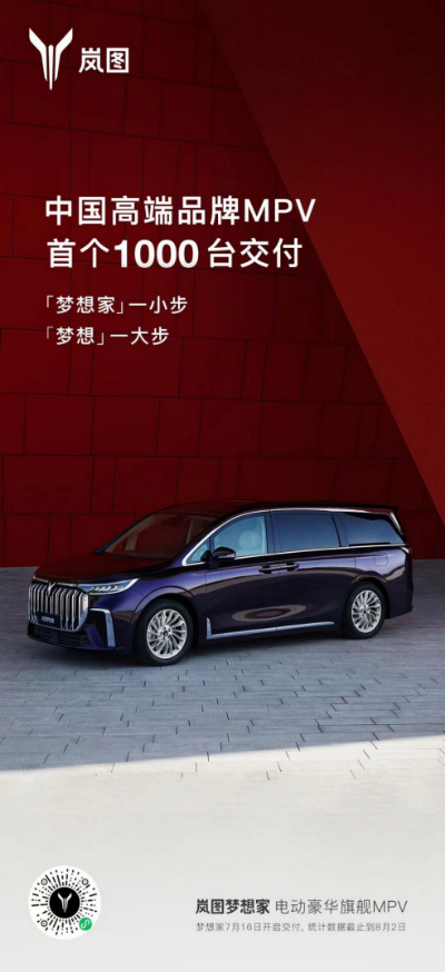??就在論壇開幕的前一天,嵐圖電動(dòng)豪華旗艦MPV嵐圖夢想家完成第1000臺(tái)用戶交付,也因此成為中國高端電動(dòng)MPV市場首個(gè)累積交付破千的品牌。