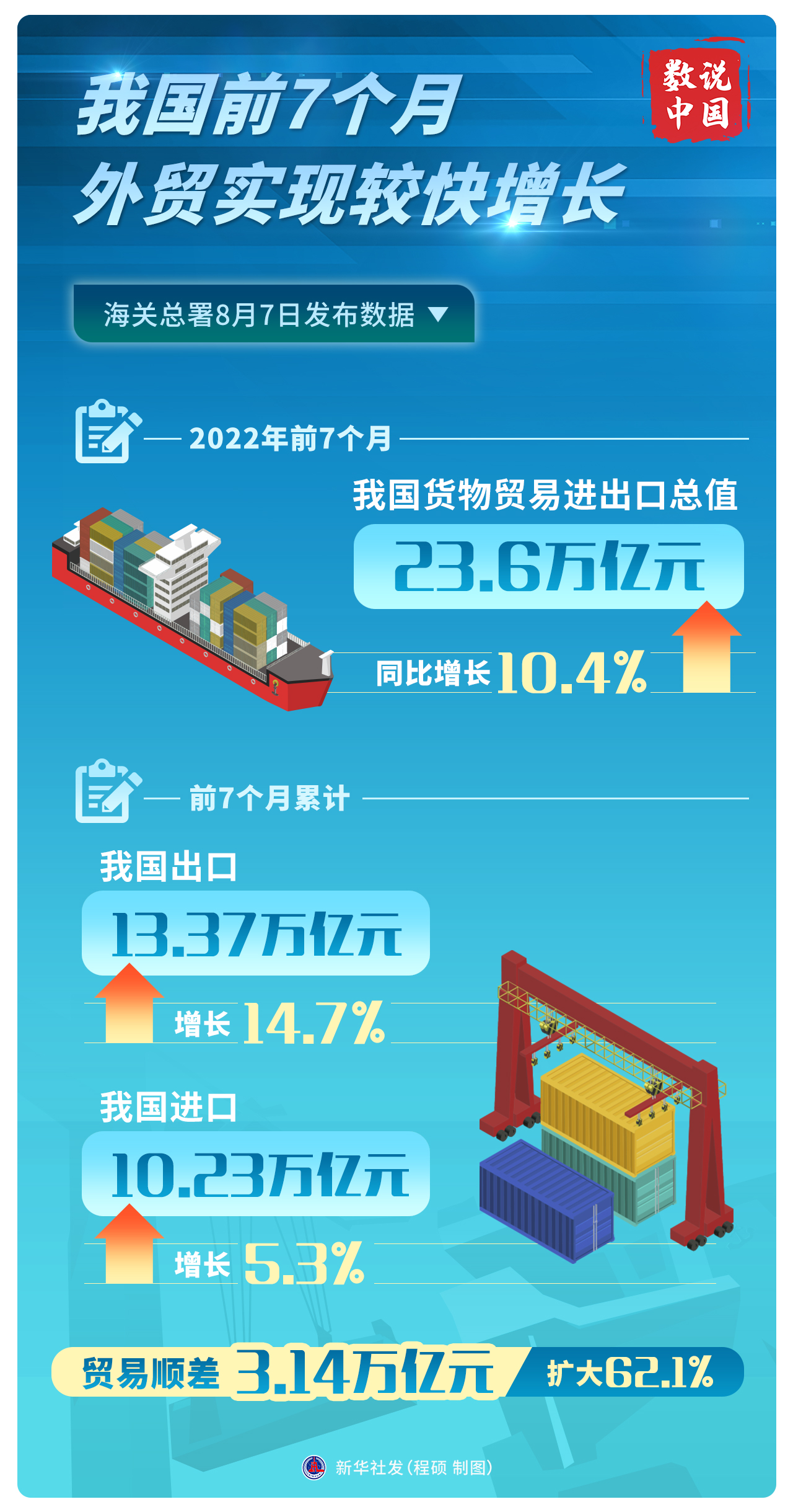 8月7日,海關(guān)總署發(fā)布數(shù)據(jù)顯示,今年前7個(gè)月,我國(guó)進(jìn)出口總值23.6萬億元人民幣,比去年同期增長(zhǎng)10.4%。其中,7月份進(jìn)出口總值3.81萬億元,同比增速進(jìn)一步提升為16.6%。