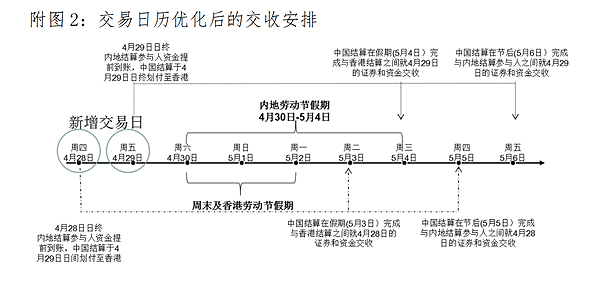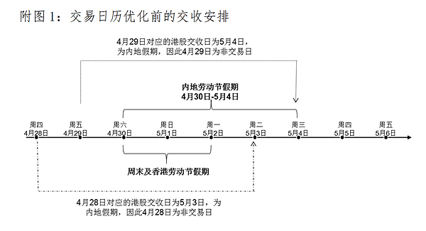 以今年的“五一”假期為例:4月28日和4月29日兩地均開市,本地投資者在當?shù)厥袌龆伎山灰住5捎谙愀凼袌鍪荰+2完成證券和資金的交收,上述交易日對應的港股交收日分別是5月3日和4日,為內(nèi)地假期,不能辦理結(jié)算業(yè)務。因此,這兩天不能進行港股通交易。而交易日歷優(yōu)化后,4月28日和29日內(nèi)地投資者也可以通過港股通買賣港股標的的證券。
