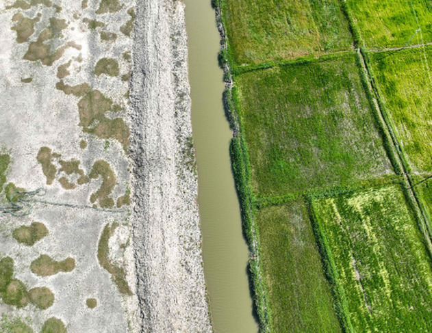 鎮(zhèn)賚縣稻田(右)與鹽堿灘涂一處交界(2022年7月12日攝,無人機(jī)照片)。潘晟昱 攝