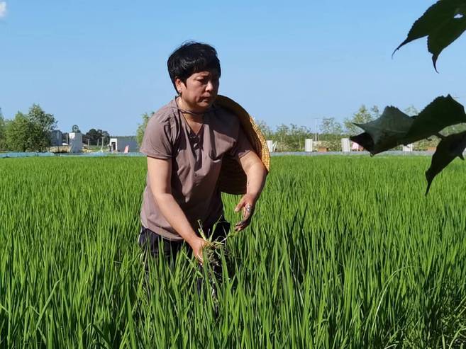白城市鎮(zhèn)賚縣慶江種養(yǎng)殖農(nóng)民專業(yè)合作社經(jīng)理張瑞平在田中清理水藻。(潘晟昱 攝)