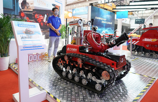 這是在2022世界機(jī)器人博覽會“機(jī)器人+制造”展區(qū)現(xiàn)場拍攝的防爆消防偵察機(jī)器人(8月19日攝)。