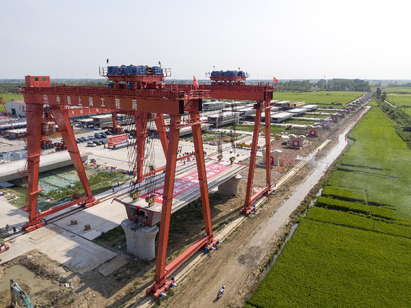 8月25日拍攝的滬渝蓉高鐵天門段首榀箱梁架設(shè)現(xiàn)場(chǎng)(無(wú)人機(jī)照片)。新華社記者 熊琦 攝