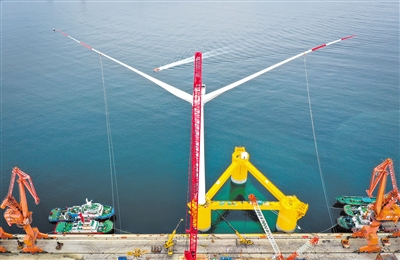 由中國船舶集團海裝風電股份有限公司牽頭,聯(lián)合相關單位自主研制的“扶搖號”浮式風電機組浮體平臺上配備6.2兆瓦抗臺型I類風力發(fā)電機組,在深遠海應用場將依靠九個對稱分布的懸錨鏈系泊實現(xiàn)固定。圖為完成總裝的國內首臺深遠海浮式風電裝備“扶搖號”在茂名廣港碼頭靜待拖航(無人機照片)。記者 劉大偉 攝