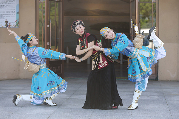 9月4日,工作人員在赫哲民俗展示館前表演赫哲族舞蹈。新華社記者 張濤 攝