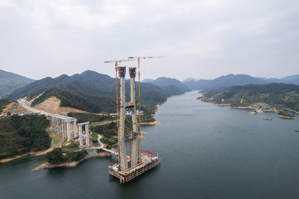 當日,官(莊)新(化)高速全線重點控制性工程馬路口資水特大橋主墩封頂,即將進入橋梁上構(gòu)施工階段,為早日通車運行奠定了基礎(chǔ)。馬路口資水特大橋位于湖南省益陽市安化縣柘溪水庫內(nèi),全長1187米,主跨500米,其中水中主塔高202.4米。