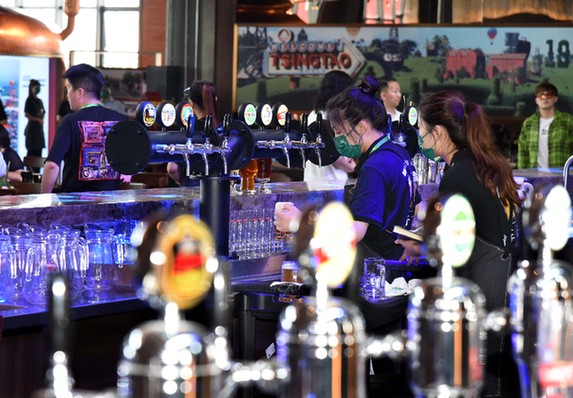 在“青啤時(shí)光海岸精釀花園”餐廳,工作人員為顧客打啤酒。記者 李紫恒 攝