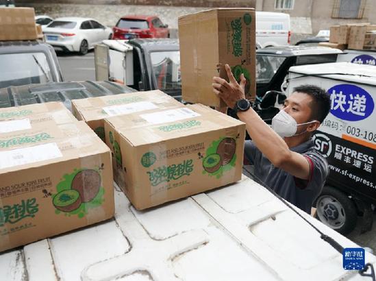 快遞員劉闊在北京市西城區(qū)陶然亭街道一處順豐速運營業(yè)點做送貨前的準(zhǔn)備(2022年8月28日攝)。 新華社記者 張晨霖 攝
