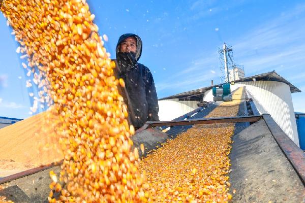 吉林省公主嶺市環(huán)嶺街道土城子村志和農(nóng)機(jī)服務(wù)專業(yè)合作社剛收獲的玉米。(新華社記者許暢 攝)