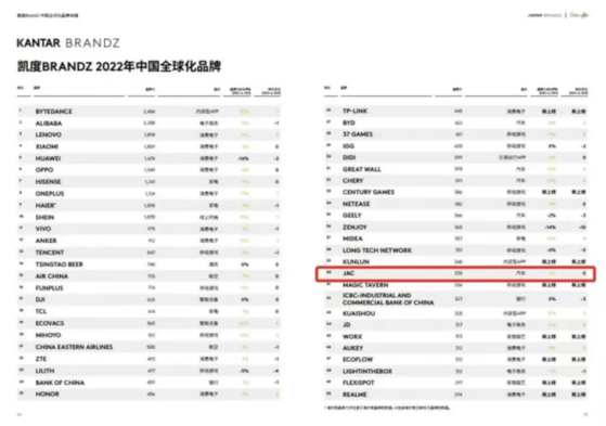 作為最早布局海外市場(chǎng)的中國(guó)汽車品牌之一,江汽集團(tuán)堅(jiān)定“走出去”的步伐,積極響應(yīng)“一帶一路”倡議,加大海外市場(chǎng)開(kāi)拓力度,進(jìn)一步推動(dòng)公司國(guó)際業(yè)務(wù)持續(xù)向上向好,JAC品牌的世界影響力日益增強(qiáng),底色更亮、成色更足。江汽集團(tuán)位列Brand Z中國(guó)全球化品牌第40位,中國(guó)汽車品牌第5位。