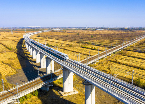 這是在天津北辰區(qū)拍攝的動車組列車行駛在京濱城際鐵路寶坻至北辰段(2022年11月4日攝,無人機照片)。