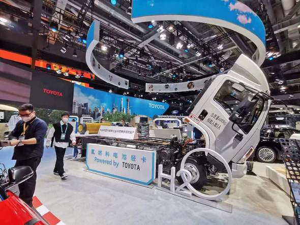 豐田汽車在2022進(jìn)博會汽車展館展出的搭載豐田氫燃料電池TL Power80的豐田和國內(nèi)整車企業(yè)共同攜手生產(chǎn)的氫燃料電池輕卡。記者 周武英 攝