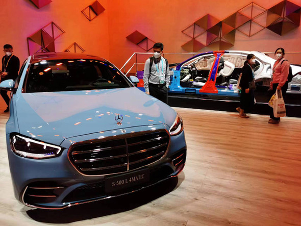 在第五屆進(jìn)博會汽車展區(qū),梅賽德斯-奔馳展出的頂級豪華車型S500L 4MATIC。記者 周武英 攝
