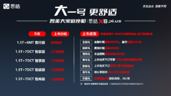 思皓X8 PLUS共5款車型,官方指導價9.98萬元-13.98萬元,并尊享多重大禮:訂車可享受至高8000元金融補貼、至高8000元增換購補貼、核心零部件5年或20萬公里質保、3年免費娛樂流量(3G/月)、上市當天下訂可享10萬公里免費基礎保養(yǎng)和至高萬倍膨脹金等,誠意十足,讓廣大用戶悅享高品質舒適出行。
