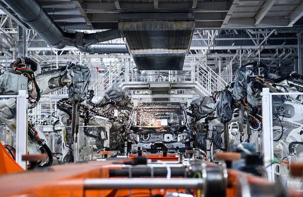 在吉林長(zhǎng)春中國第一汽車集團(tuán)有限公司紅旗繁榮工廠焊裝車間內(nèi),焊裝機(jī)器人在生產(chǎn)線上焊接車身。 新華社記者 顏麟蘊(yùn) 攝