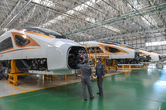 在中車長(zhǎng)春軌道客車股份有限公司高速動(dòng)車組裝配車間里,高級(jí)技師胡俊祥(右)與同事馬洪偉檢查“復(fù)興號(hào)”高鐵列車電氣系統(tǒng)。 新華社記者 張楠 攝