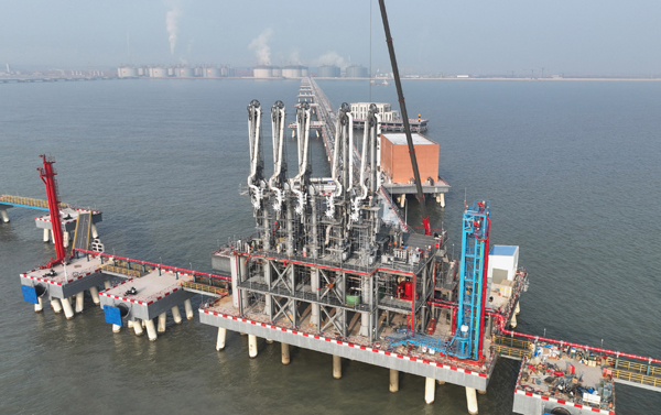 2023年1月4日,工人在唐山市曹妃甸區(qū)新天LNG(液化天然氣)項(xiàng)目接收站碼頭施工(無人機(jī)照片)。
