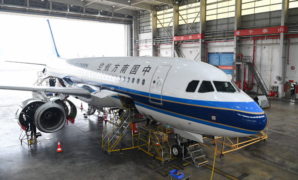 2023年1月5日,在位于海南省海口市的中國南方航空美蘭基地機(jī)庫,工程師在對(duì)飛機(jī)進(jìn)行檢修。