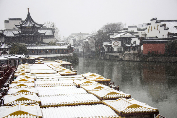 南京夫子廟景區(qū)秦淮河兩岸雪景。資料照片