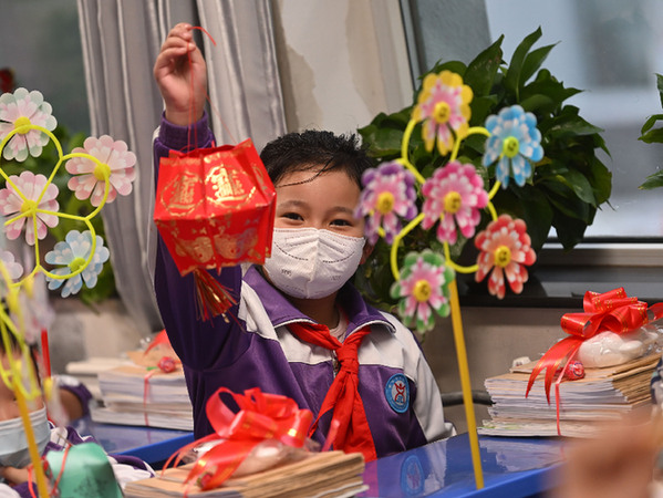 2月13日,在西寧市城西區(qū)文匯小學(xué),學(xué)生在展示自己的假期手工作業(yè)。當日,青海省西寧市的小學(xué)生迎來開學(xué)首日,孩子們在降雪中開啟新學(xué)期。