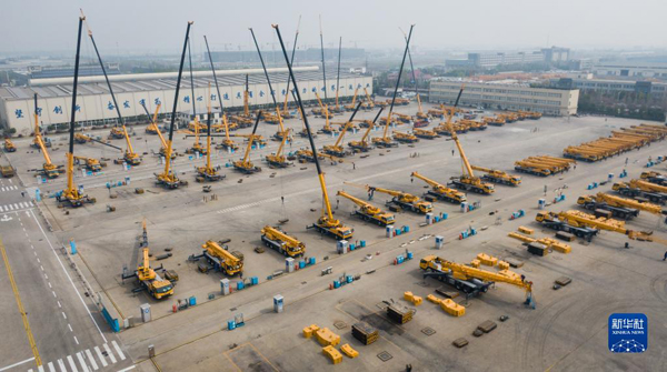 這是2019年4月4日在徐工集團(tuán)徐州重型機(jī)械有限公司拍攝的調(diào)試中的起重機(jī)(無(wú)人機(jī)拍攝)。新華社記者 李響 攝