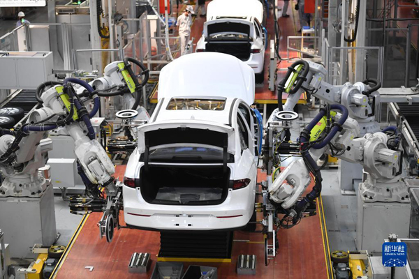在廣州市番禺區(qū)的廣汽埃安新能源汽車股份有限公司總裝生產(chǎn)線,機(jī)器人手臂在安裝汽車輪胎(2023年2月24日攝)。新華社記者 鄧華 攝