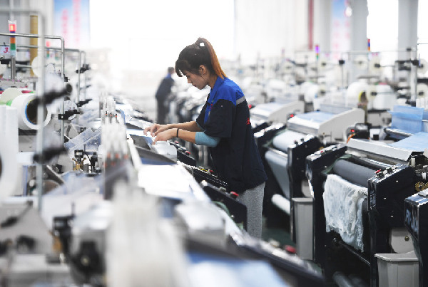 在“中國新興紡織產(chǎn)業(yè)基地縣”河南省信陽市淮濱縣,新濤紡織科技有限公司的工人正在車間忙碌。