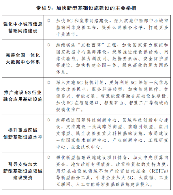(計劃報告中的專欄9:加快新型基礎(chǔ)設(shè)施建設(shè)的主要舉措)