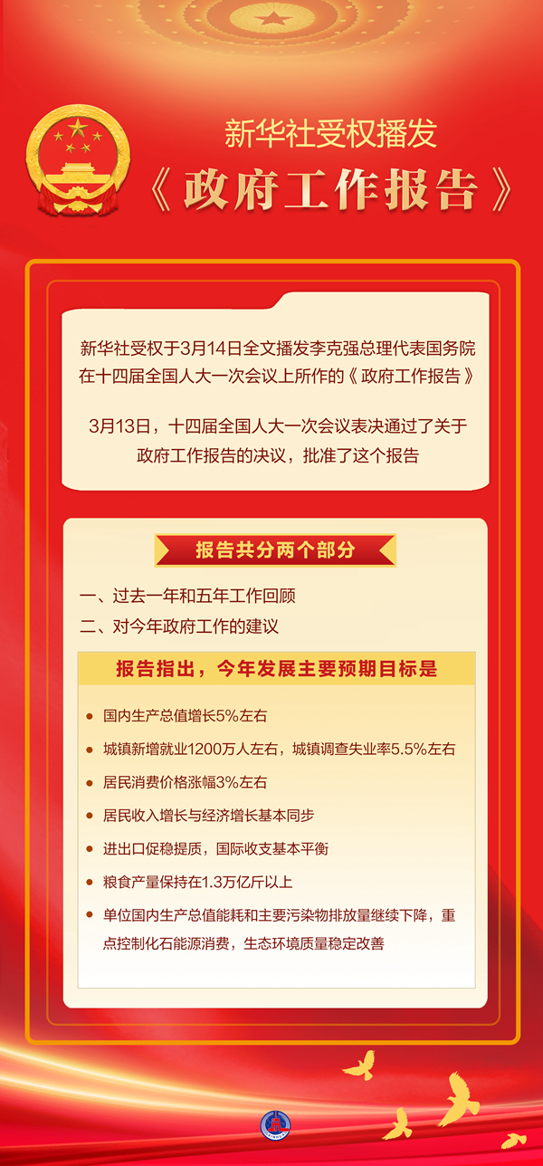新華社北京3月14日電 新華社受權(quán)于14日全文播發(fā)李克強(qiáng)總理代表國(guó)務(wù)院在十四屆全國(guó)人大一次會(huì)議上所作的《政府工作報(bào)告》。3月13日,十四屆全國(guó)人大一次會(huì)議表決通過了關(guān)于政府工作報(bào)告的決議,批準(zhǔn)了這個(gè)報(bào)告。