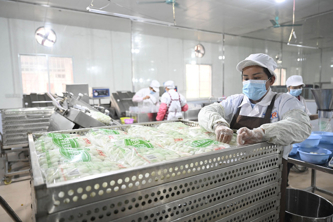 3月27日,在柳州市柳城縣社沖鄉(xiāng)柳州螺螄粉原材料基地里,工人在鵪鶉蛋加工廠車間里忙碌。