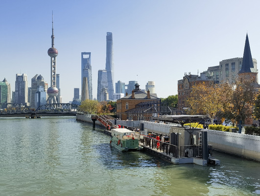 一艘蘇州河游船停靠在上海外灘源碼頭。記者 陳愛平 攝