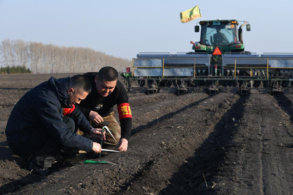 4月8日,在位于黑龍江省北安市的北大荒集團建設農(nóng)場有限公司第四管理區(qū)一處農(nóng)田,農(nóng)業(yè)技術員在監(jiān)測施肥作業(yè)質量。新華社記者 王松 攝
