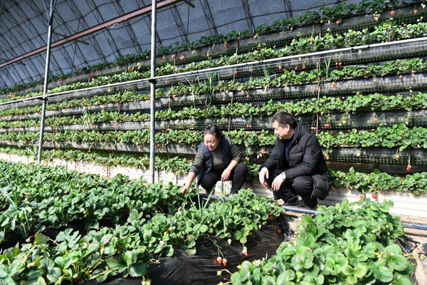 3月2日,在吉林市永吉縣口前鎮(zhèn),農(nóng)業(yè)技術人員(右)向農(nóng)民傳授草莓種植技術。新華社記者 張楠 攝