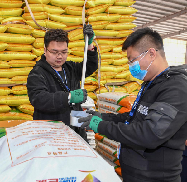 3月23日,在吉林省四平市梨樹縣一家農(nóng)資生產(chǎn)企業(yè),工作人員對企業(yè)生產(chǎn)的產(chǎn)品進行抽樣檢驗。新華社記者 張楠 攝