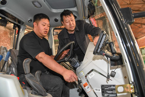 3月23日,在吉林省四平市梨樹縣白山鄉(xiāng)岫巖村,梨樹縣農(nóng)機推廣總站站長張志剛(右)幫助農(nóng)民調試農(nóng)機。新華社記者 張楠 攝