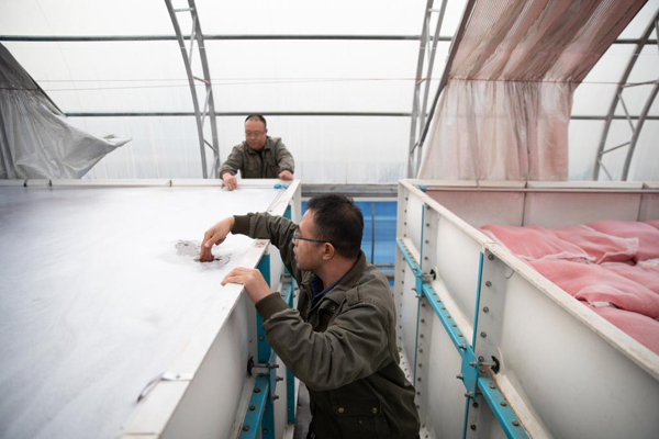 3月24日,在北大荒集團八五〇農(nóng)場有限公司智能化水稻芽種生產(chǎn)中心,工作人員檢查浸種情況。新華社記者 張濤 攝