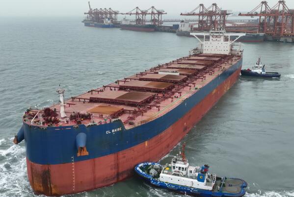 4月17日,一艘輪船在拖輪的協(xié)助下駛離唐山港曹妃甸港區(qū)礦石碼頭(無人機照片)。記者從河北省唐山市海洋口岸和港航管理局獲悉,今年1至3月份,河北港口集團唐山港完成貨物吞吐量20163萬噸,同比增長12.73%。新華社記者 楊世堯 攝