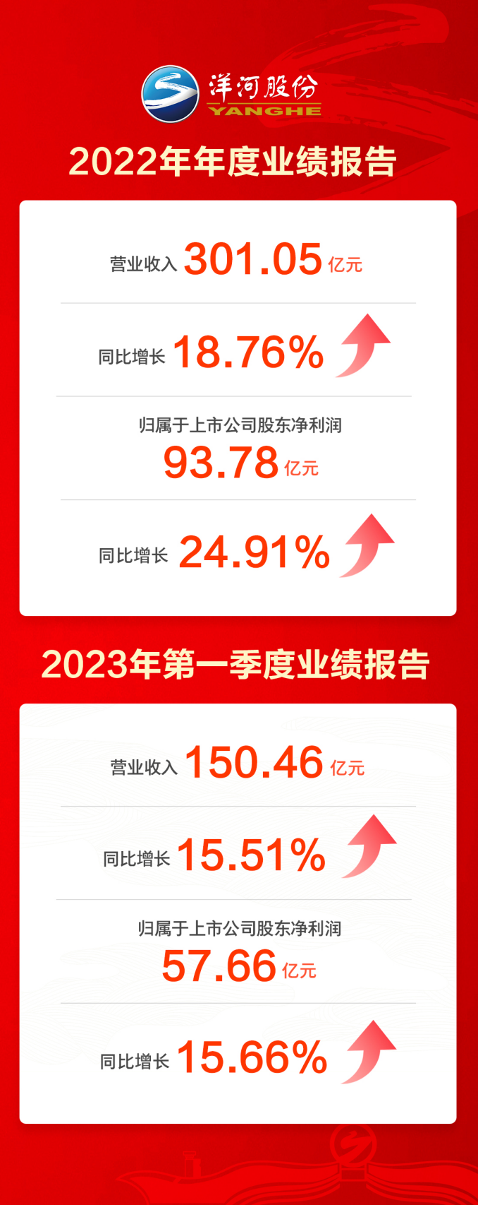 4月25日晚,洋河股份披露了2022年年報及2023年一季度報。報告顯示,2022年公司實現(xiàn)營業(yè)收入301.05億元,同比增長18.76%;歸屬于上市公司股東凈利潤93.78億元,同比增長24.91%。同步發(fā)布的2023年一季度報顯示,一季度實現(xiàn)營業(yè)收入150.46億元,同比增長15.51%;歸屬于上市公司股東凈利潤57.66億元,同比增長15.66%。