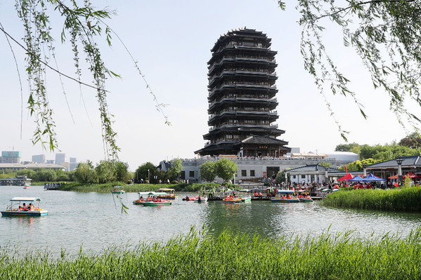 5月2日,游人在山東淄博齊盛湖泛舟游玩。“五一”小長假期間,人們來到各地景區(qū)游玩,樂享假期。新華社發(fā)(張進(jìn)剛 攝)