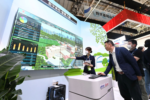工作人員在第六屆數(shù)字中國(guó)建設(shè)成果展上介紹數(shù)字高校智慧大腦綜合管理平臺(tái)。該平臺(tái)由中國(guó)電信福州分公司參與打造。