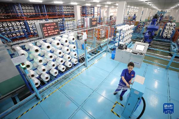 在位于江蘇省蘇州市吳江區(qū)的恒力(蘇州)產(chǎn)業(yè)園內(nèi)的高性能滌綸工業(yè)絲智能車間內(nèi),員工對工業(yè)絲進(jìn)行包裝前的外檢作業(yè)(3月15日攝)。新華社記者 毛俊 攝