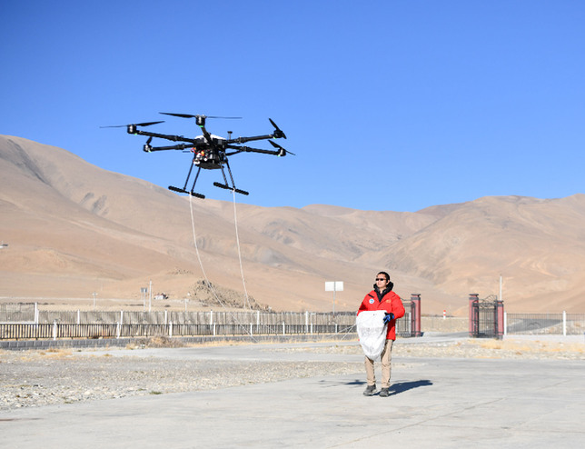 在中國科學(xué)院珠穆朗瑪大氣與環(huán)境綜合觀測(cè)研究站,科考隊(duì)員放飛無人機(jī)采集空氣樣本(5月10日攝)。
