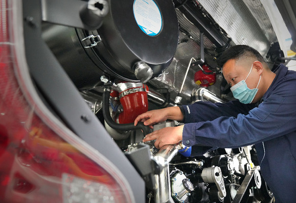 工作人員在宇通新能源廠區(qū)高端及海外承裝車(chē)間進(jìn)行發(fā)動(dòng)機(jī)檢測(cè)。記者 李安 攝