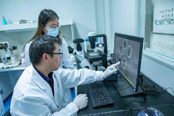 中國農(nóng)業(yè)科學(xué)院蘭州畜牧與獸藥研究所博士岳耀敬和團隊成員討論羔羊體外胚胎發(fā)育實驗。
