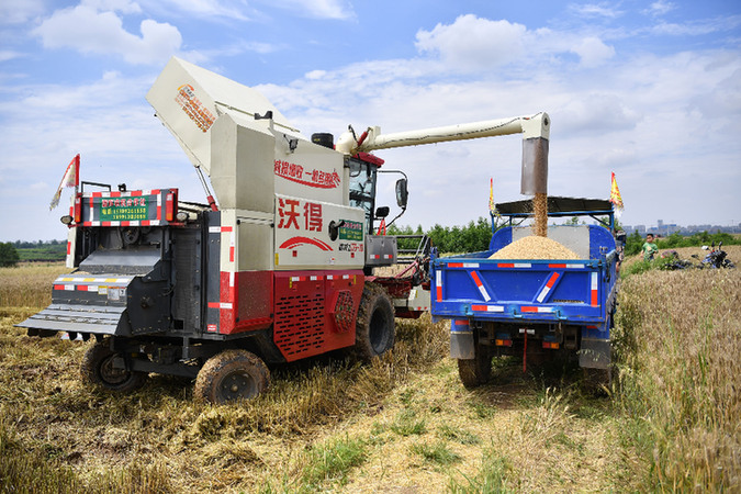 在西安市鄠邑區(qū)渭豐街道真守村,幾臺(tái)履帶式收割機(jī)一刻不停地在連片麥田里“聯(lián)合”作業(yè),將谷倉(cāng)填滿倒入翻斗車后,這些收割機(jī)又馬不停蹄地調(diào)轉(zhuǎn)機(jī)頭,再入麥田。“今年夏收已經(jīng)比往年晚了三四天,再不抓緊,就真的‘九成熟、十成收;十成熟、一成丟’了。”來(lái)不及停頓片刻,收割機(jī)駕駛員王成旭又在另一壟麥田,繼續(xù)著機(jī)收作業(yè)。