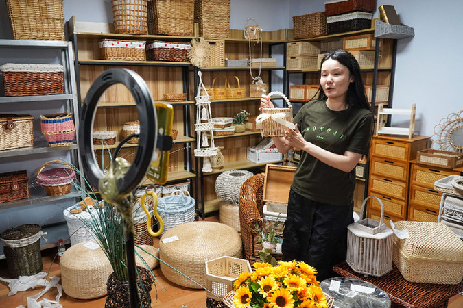 6月6日,臨沂金柳工藝品有限公司員工在電商平臺(tái)銷售柳編產(chǎn)品。