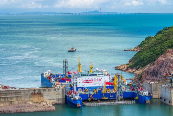 “一航津安1”號(hào)沉管運(yùn)輸安裝一體船拖帶E23管節(jié)和最終接頭從珠海桂山島啟航,前往沉放水域(6月8日攝,無(wú)人機(jī)照片)。
