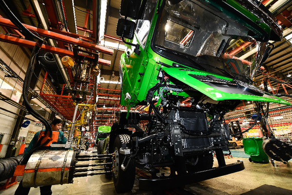 工人在中國(guó)重汽集團(tuán)濟(jì)南商用車有限公司整車裝配生產(chǎn)線上作業(yè)。記者 郭緒雷 攝